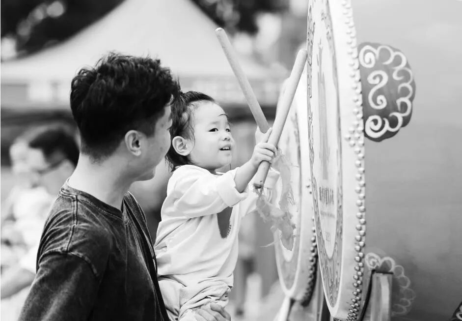 图:10月6日,在山东省滕州汉画像石馆门外,家长陪着孩子体验击鼓。新华社发