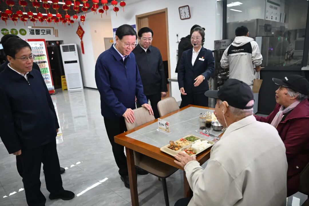 省委书记许昆林来到沈阳市大东区长安社区,与正在长者食堂用餐的老人交谈。