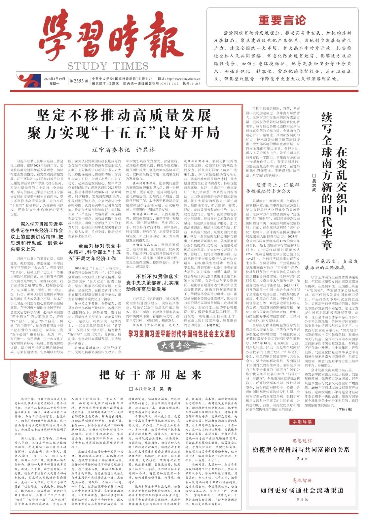 1月19日,《学习时报》头版头条刊发辽宁省委书记许昆林署名文章《坚定不移推动高质量发展聚力实现“十五五”良好开局》。