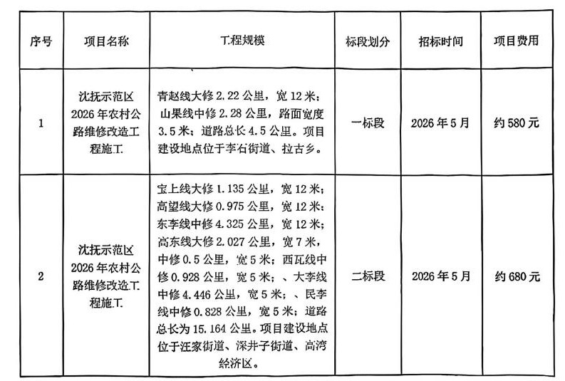 沈抚示范区2026年农村公路维修改造工程施工