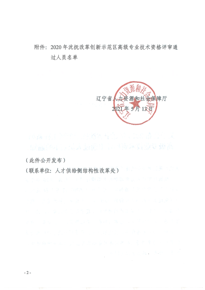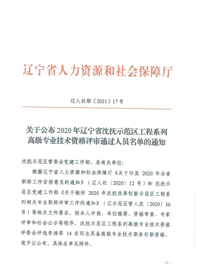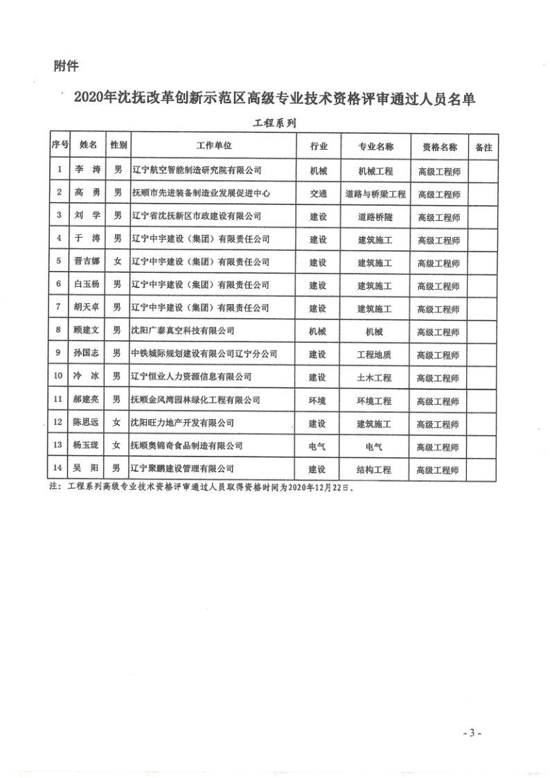 关于公布2020年辽宁省沈抚示范区工程系列高级专业技术资格评审通过人员名单的通知