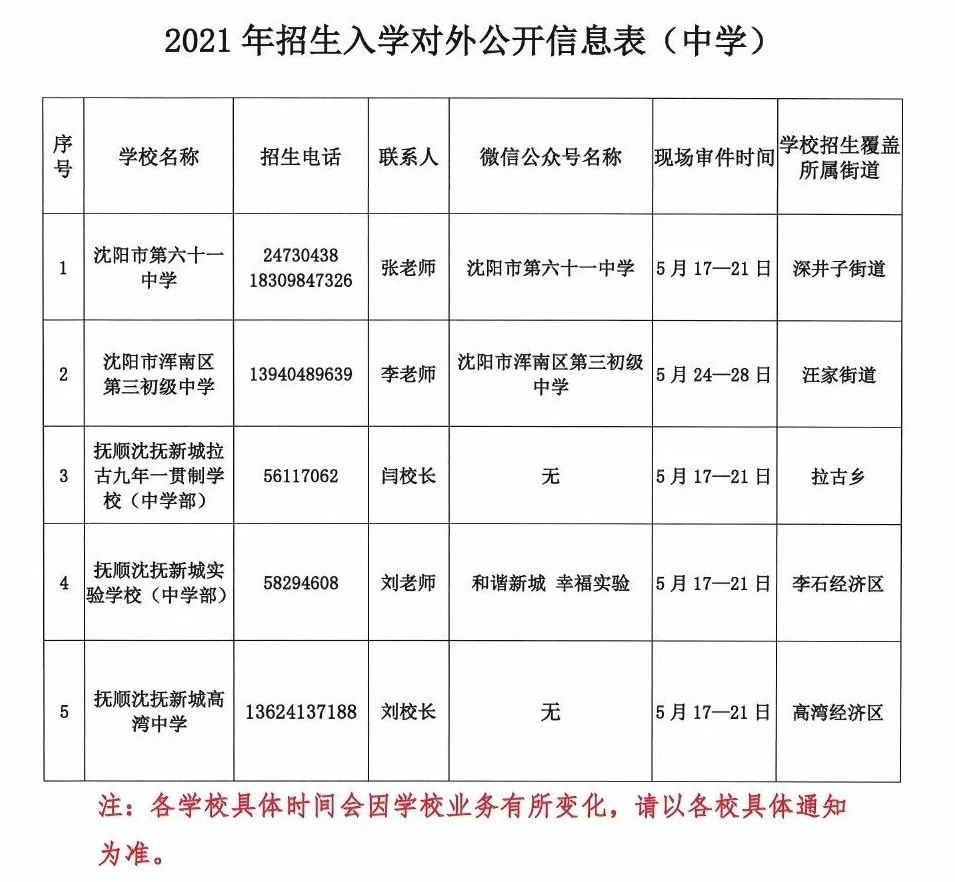 为确保沈抚示范区(沈阳和抚顺)2021年小升初工作有序进行,现对沈抚示范区域内各校六年级毕业生进行普查,同步进行初中招生工作,请家长做好招生入学准备。具体安排如下:一、招生入学范围符合在沈抚示范区域内(沈阳和抚顺)各中学就读条件的六年级毕业生。二、招生入学时间1.有沈抚示范区域内(沈阳或抚顺)房产或户口的六年毕业生:2021年5月17日9:00—2021年5月21日16:302.来沈抚示范区域内外来务工子女:2021年5月24日9:00—2021年5月28日16:30三、招生入学方式沈抚示范区域内(沈阳和抚顺)各中学,现场核查原件。四、招生入学流程请符合条件的家长携带好相关资料原件及复印件,到汪家、深井子、李石、拉古、高湾对应街道中学现场查验相关证明资料并登记。五、招生入学需准备材料(一)已有沈抚示范区域内(沈阳或抚顺)房产并取得房证需准备的材料1.房产证原件及复印件(借用祖父母或外祖父母房产的,需学生、父母与祖父母或外祖父母同户同住满3年并提供沈阳市或抚顺市不动产登记中心开具的父母双方无房证明)。2.学生户口本原件及复印件(首页、父母页、学生本人页)。3.出生证明原件及复印件。4.如房屋所有人属单独所有,家长需提供结婚证原件及复印件;如夫妻双方离异状态,需提供离婚证原件、离婚协议原件及复印件。5.沈阳市或抚顺市不动产登记中心提供的“不动产信息查询表”原件(房产查档证明),请在学校原件核查时上交。(二)已有沈抚示范区域内(沈阳或抚顺)房产但未取得房证需准备的材料1.已备案的购房合同、购房发票、入住通知单、契税发票原件及复印件(借用祖父母或外祖父母房产的,需学生、父母与祖父母或外祖父母同户同住满3年并提供沈阳市或抚顺市不动产登记中心开具的父母双方无房证明)。2.学生户口本原件及复印件(首页、父母页、学生本人页)。3.出生证明原件及复印件。4.如房屋所有人属单独所有,家长需提供结婚证原件及复印件;如夫妻双方离异状态,需提供离婚证、离婚协议原件及复印件。5.沈阳市或抚顺市不动产登记中心提供的“不动产信息查询表”原件(房产查档证明),请在学校原件核查时上交。(三)已有沈抚示范区域内(沈阳或抚顺)房屋征收补偿安置协议需准备的材料1.房屋征收补偿安置协议书、回迁安置公证书、入住通知单原件及复印件(借用祖父母或外祖父母房产的,需学生、父母与祖父母或外祖父母同户同住满3年并提供沈阳市或抚顺市不动产登记中心开具的父母双方无房证明)。2.学生户口本原件及复印件(首页、父母页、学生本人页)。3.出生证明原件及复印件。4.结婚证原件及复印件;如夫妻双方离异状态,需提供离婚证、离婚协议原件及复印件。(四)只有沈抚示范区域内(沈阳或抚顺)户口无示范区房产需准备的材料1.学生户口本原件及复印件(首页、父母页、学生本人页)。2.沈阳市或抚顺市不动产登记中心开具的父母双方无房证明原件。3.出生证明原件及复印件。4.如夫妻双方离异状态,需提供离婚证、离婚协议原件及复印件。(五)无沈抚示范区域内(沈阳或抚顺)房产和户口的来沈务工子女需准备的材料1.父母双方居住证原件或领取凭证原件及复印件。2.父母双方工作证明原件。3.租房协议原件及复印件。4.学生户口本原件及复印件(首页、父母页、学生本人页)。5.出生证明原件及复印件。6.只能提供一个监护人居住证或工作证明的,需提供结婚证原件及复印件;如夫妻双方离异状态,需提供离婚证、离婚协议原件及复印件。六、需要说明的问题1.2021年沈抚示范区学位接收排序顺序如下:①房户合一(按房户合一时间先后排序);②房户不合一,以房产为准(按取得房证或备案合同时间先后排序);③房户不合一,以户口为准(按落户时间先后排序)。剩余学位排满后,仍未排入的学生将由沈抚示范区社会事业局教育科负责统一调剂。报名学校并不代表是最终入学的学校。2.来沈抚示范区外来务工人员子女按照回避学位紧张学校的原则进行分配。3.学区内每套住房3年内只能安排一名适龄儿童入学(非独生子女家庭除外)。4.房屋用途为商业的,按照相关文件要求执行。其他不明事宜请致电学区所属学校招生电话(见附录)或者沈抚示范区社会事业局教育科咨询电话:024-56608821,(上午8:30-11:30,下午13:00-17:00)。
