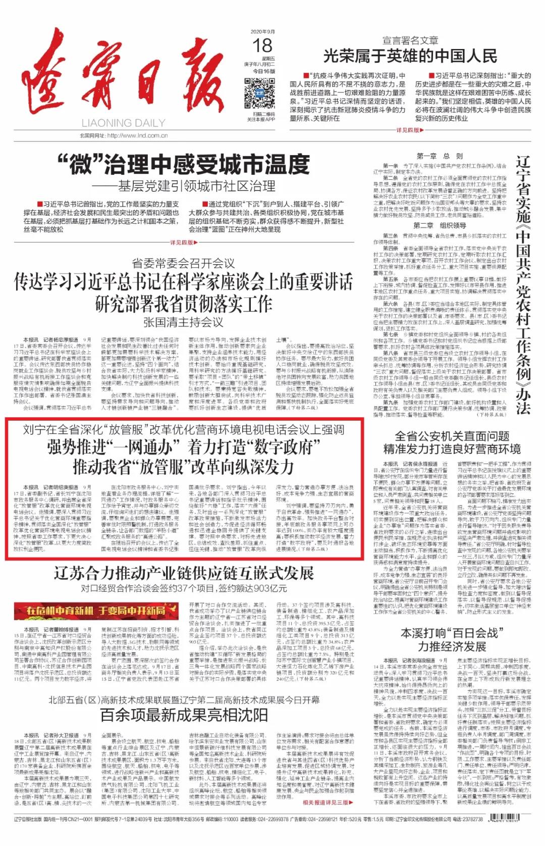 辽宁日报在9月18日第1版刊发了《刘宁在全省深化“放管服”改革优化营商环境电视电话会议上强调 强势推进“一网通办” 着力打造“数字政府” 推动我省“放管服”改革向纵深发力》新闻报道,原文如下: