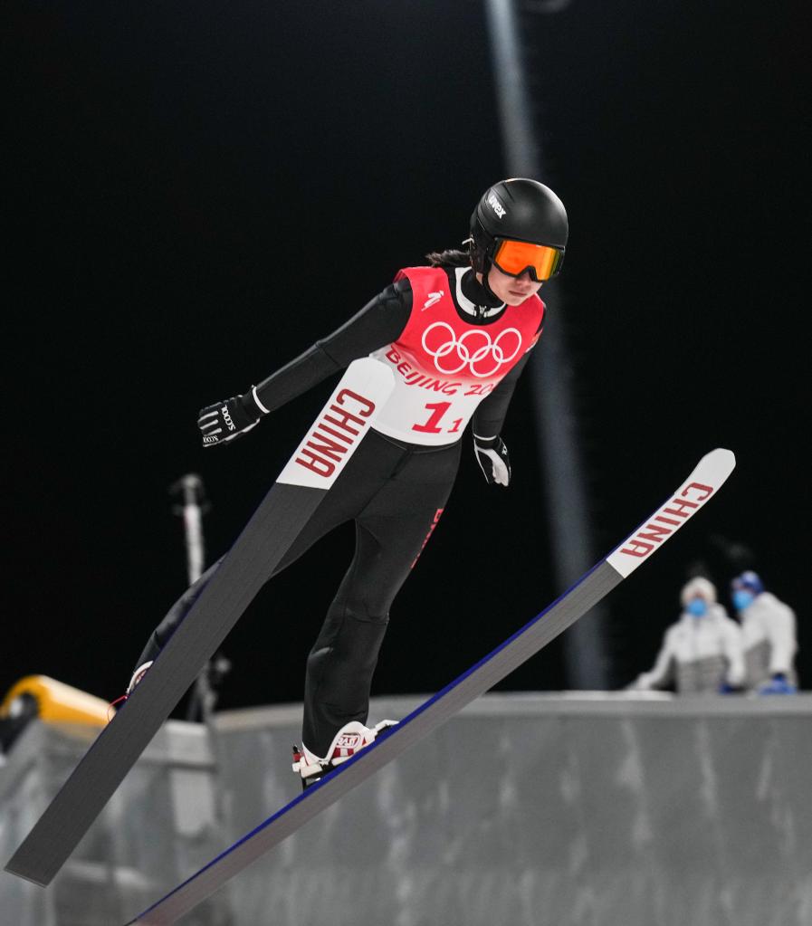 2月6日,中国选手董冰在北京冬奥会跳台滑雪混合团体比赛中。新华社记者牟宇摄
