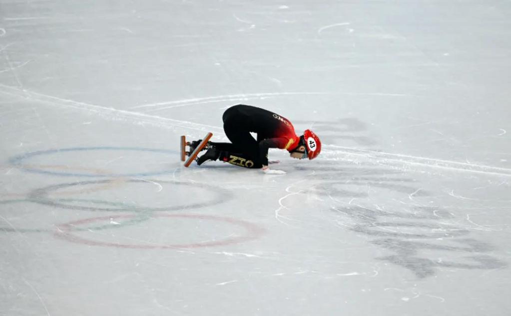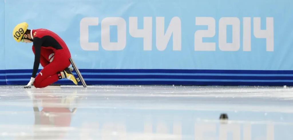 2014年2月13日,中国选手范可新在摔倒后跪在场边。新华社记者 王丽莉 摄